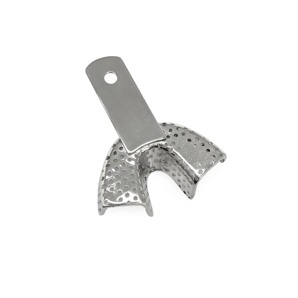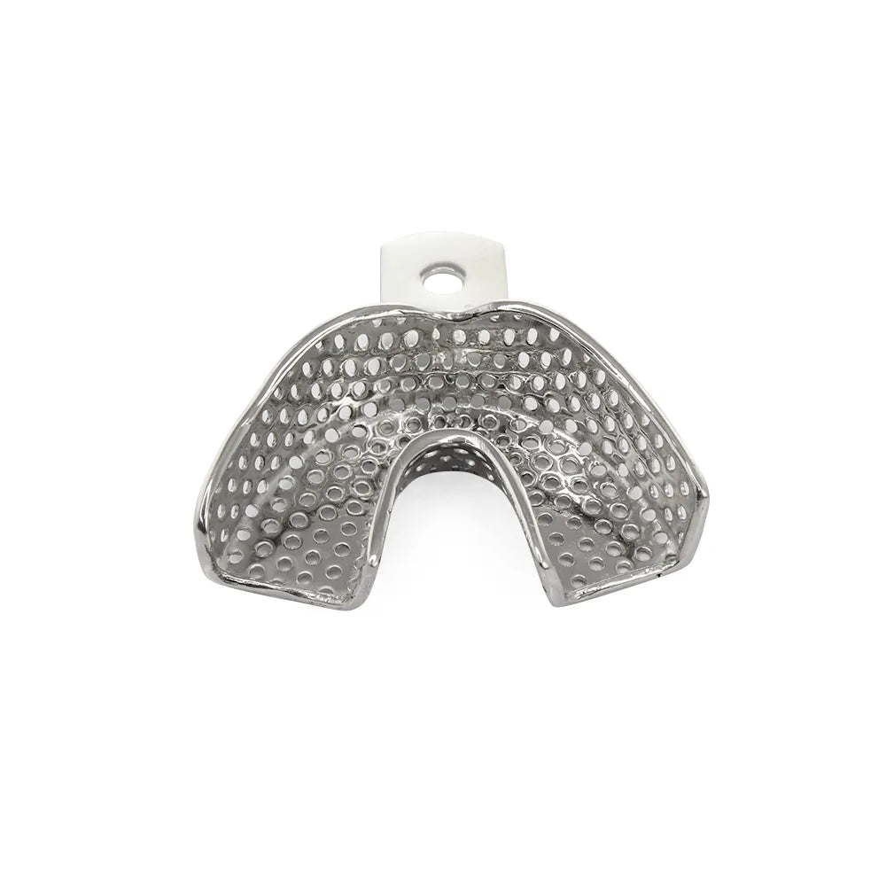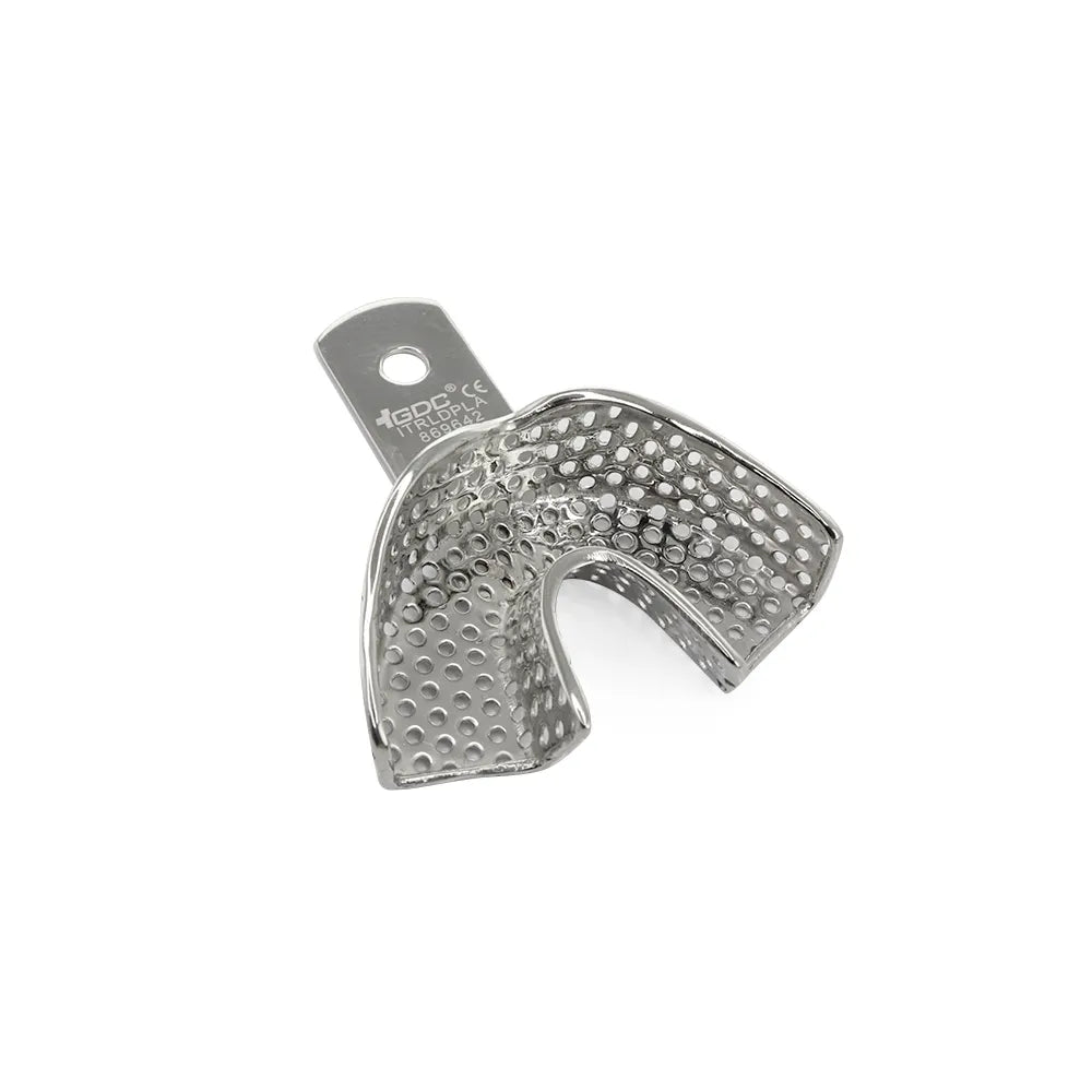 The GDC Impression Tray Anterior and Posterior Lower (Itrldpla) is a dental tool designed to aid in taking accurate impressions of the lower arch of the mouth. It is specifically intended for use in dental procedures involving the anterior (front) and posterior (back) areas of the lower jaw. The impression tray is made of high-quality, durable material that ensures stability and rigidity during the impression-taking process. It features a perforated design that allows for even distribution of the impression material and efficient flow of excess material.
