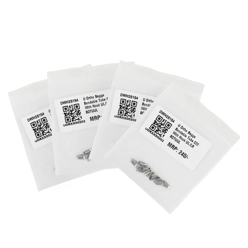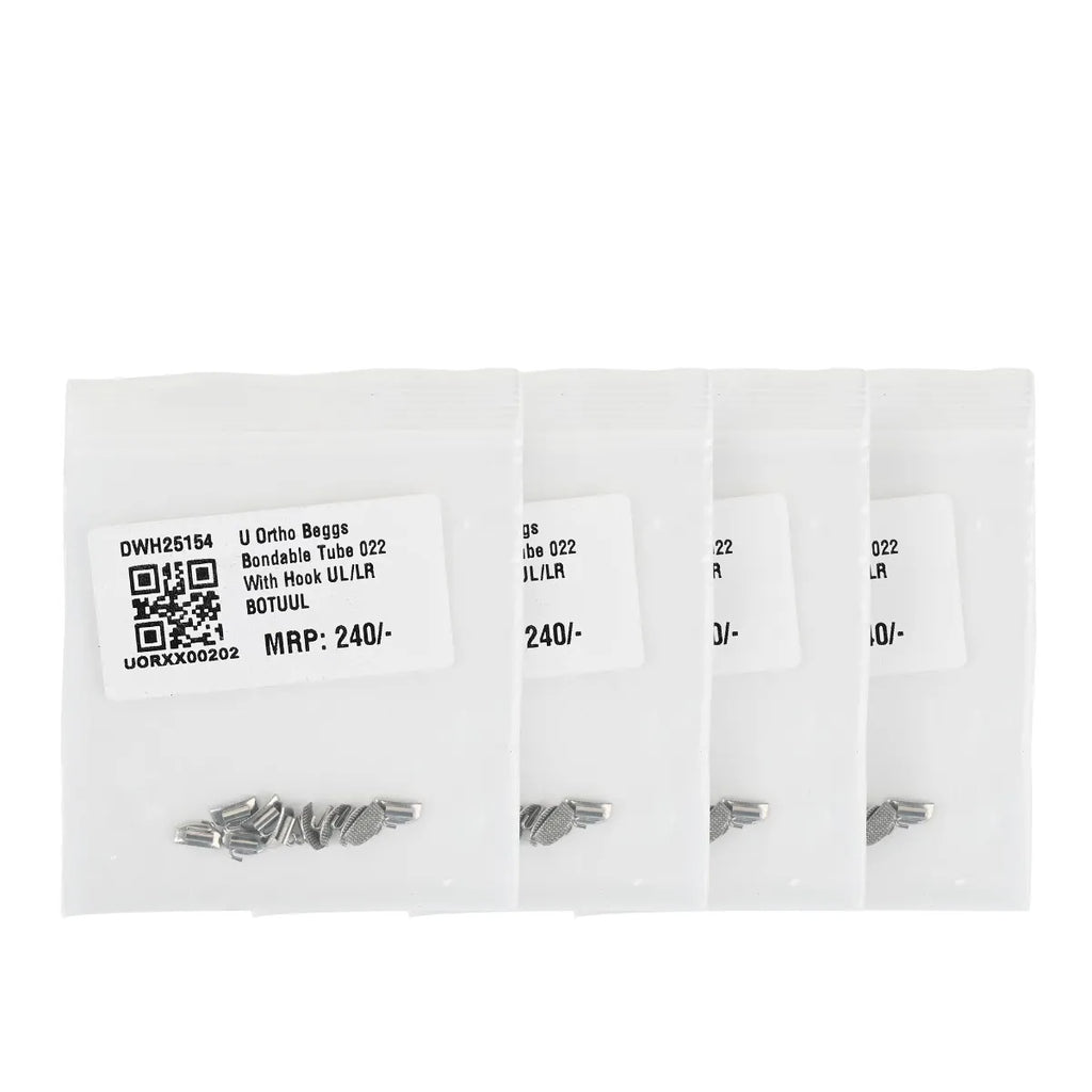 The U Ortho Beggs Bondable Tube 022 With Hook is a specialized orthodontic appliance designed for effective tooth movement and alignment. This tube features a round buccal design with a mesh pad constructed from 80-gauge material. The fine mesh pad structure allows adhesive to penetrate deeply into the mesh, ensuring optimal bond strength and stability. With its bondable nature, the tube can be securely attached to the teeth during orthodontic procedures. The 022 size indicates the slot dimension, providing ample space for accommodating various archwire sizes. The inclusion of a hook enhances versatility by allowing the attachment of elastics or other auxiliary orthodontic devices.
