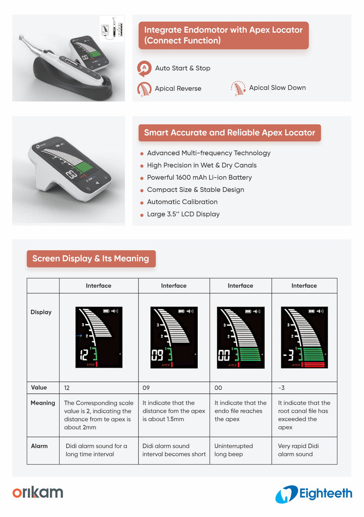 Display Display 1 Display 2 Display 3 Display 4 Value 12 09 00 -3 Meaning The corresponding scale value is 2, indicating the distance from the apex is about 2mm It indicates that the distance from the apex is about 1.5mm It indicates that the endofile has reached the apex It indicates that the root canal file has exceeded the apex Alarm Beep alarm sound for a long time interval Beep alarm sound interval becomes short Uninterrupted long beep Very rapid beep alarm sound Integrate Endomotor with E-pex Apex Locator (Connect Function)