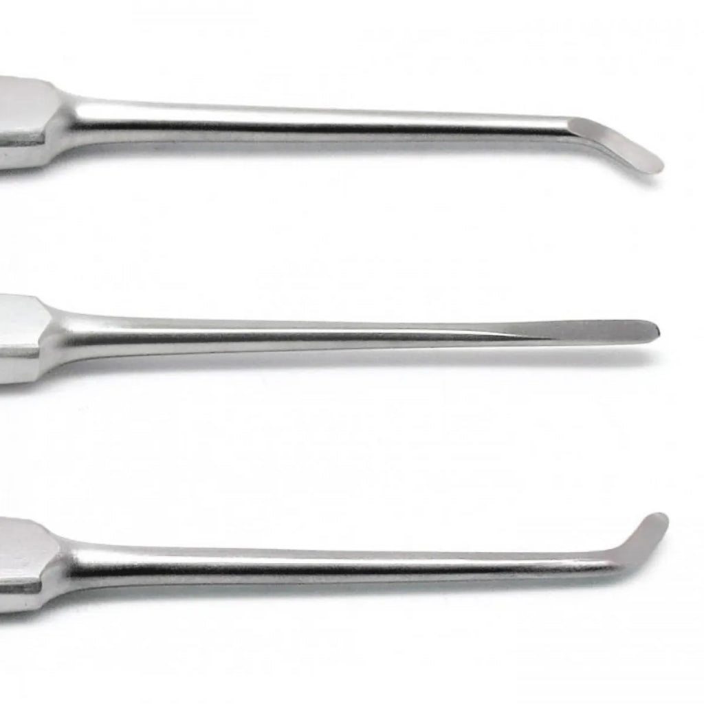 - Variety of Elevators: The set includes three different Warwick James root elevators, each with a distinct shape and size. This variety allows for the selection of the most suitable elevator based on the tooth's location and root configuration.
