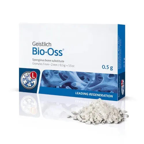 Geistlich Bio-Oss is the leading bone substitute for regenerative dentistry worldwide. It has outstanding osteo-conductive properties which leads to effective and predictable bone regeneration. The bio functionality of it is characterized by its topographic structure, hydrophilic properties and the biologic interaction that supports reliable bone formation.