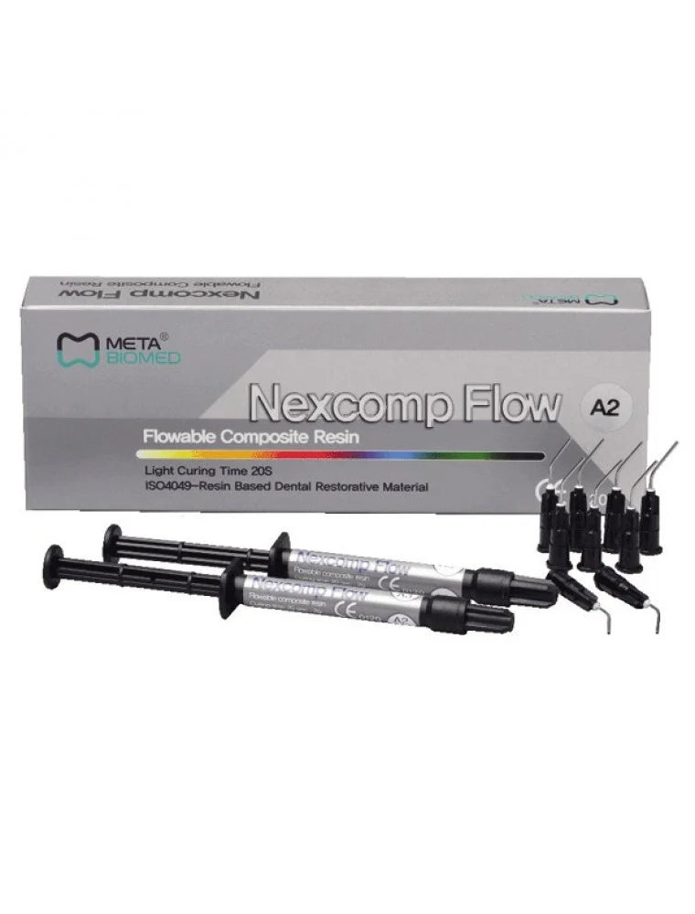 Meta Nexcomp Flow is a Nano Hybrid Flowable Composite Resin based dental restorative material .Light curing time: 20 seg