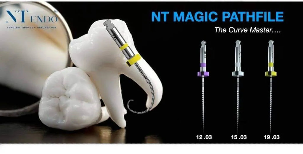 NT Magic Pathfiles are specialized rotary Nickel Titanium (NiTi) instruments meticulously engineered to create a smooth glide path in the field of rotary endodontics. What sets them apart is their superior ability to preserve the original anatomy of root canals, surpassing traditional manual stainless steel files. This preservation is vital for the success of root canal treatments. The exceptional flexibility of NT Path Files is a standout feature, thanks to their unique metallurgical composition and a small taper size of 3%. This combination allows them to effortlessly navigate the intricate twists and turns of even the most curved and narrow root canals. What makes these files truly remarkable is their capacity to significantly reduce the risk of complications such as lodging and transportation. Their unmatched flexibility ensures that the root canal procedure becomes not only more manageable but also more predictable, greatly enhancing the chances of a successful outcome. In summary, NT Path Files are indispensable tools in modern endodontics, guaranteeing the preservation of the original canal anatomy while optimizing treatment results. Their flexibility, precision, and reliability make them a preferred choice for dental professionals seeking excellence in rotary endodontics.