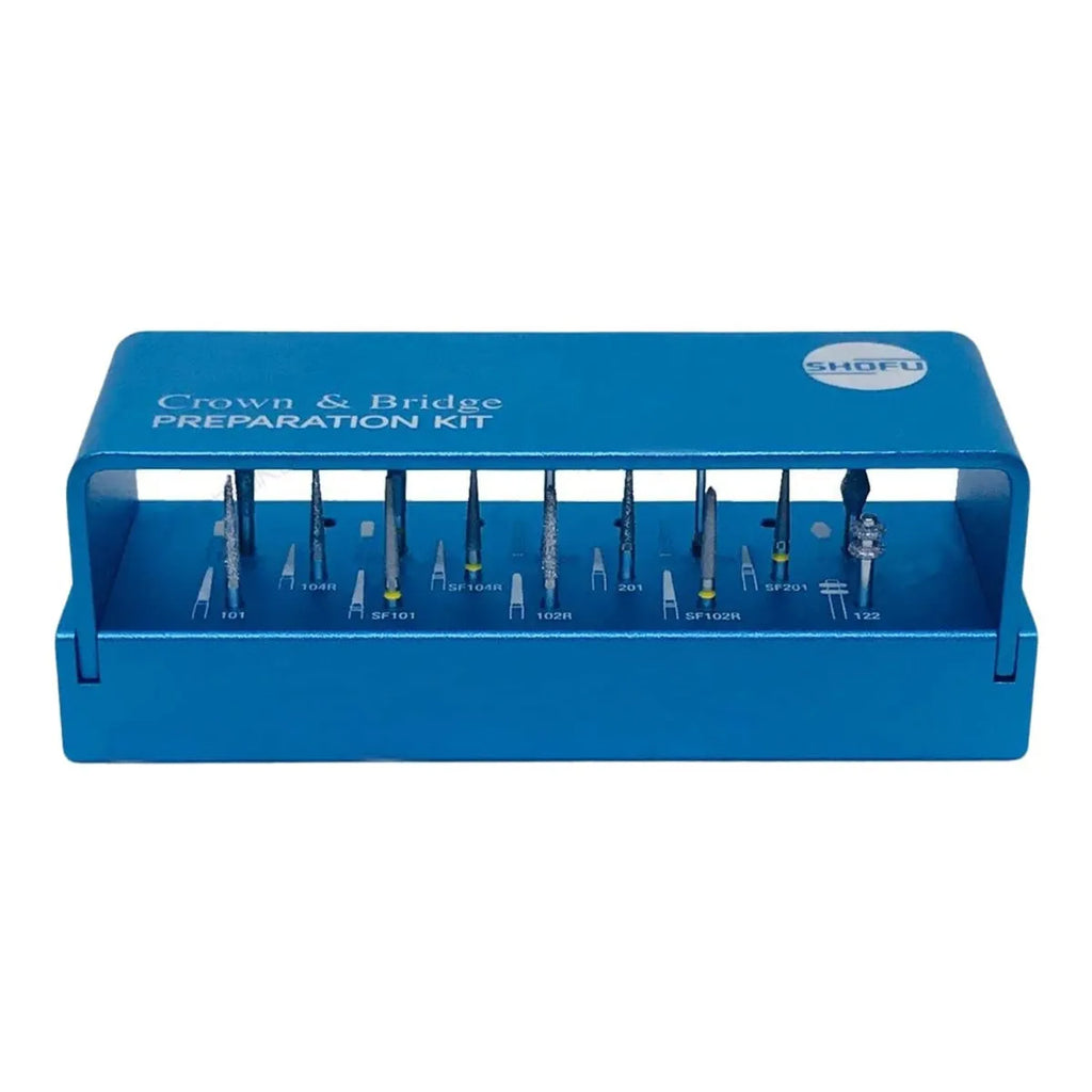 The Crown & Bridge Preparation kit is designed to offer speedy, simple and accurate tooth preparation for a wide range of crown and bridge restorations, veneers and onlays. Precise depth orientation grooves can be achieved easily with the specially designed depth cutting diamond points. 2 special "Tissue-Protective End-Cutting Burs" for shoulder preparation and finishing under gingival margins without injuring the soft tissue. These points are hygienically organized in an aluminium bur block (autoclavable) for convenient sterilization and easy replacement.