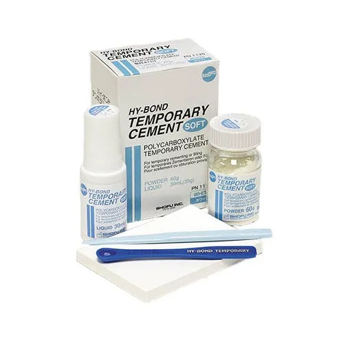 Shofu Hy-Bond Temporary Cement (Soft) is a non-eugenol, polycarboxylate-based temporary cement designed for temporary cementation of provisional crowns, fixed restoration and implant prosthesis, indirect pulp capping and temporary sealing of prepared cavities as an intermediate restorative. Contains the patented Hy-Agent additive with tannin-fluoride that seals dentinal tubules to prevent pulpal irritation.