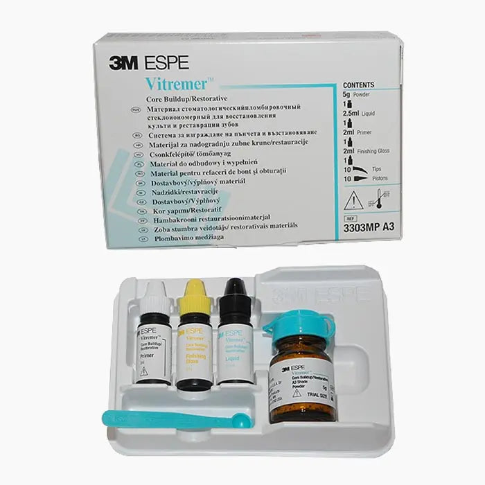 Vitremer is a glass ionomer core build-up and restorative material with patented Triple Curing Technology. Patented triple curing technology – Light-curing, chemical curing, and additive glass ionomer setting reaction. Highly aesthetic due to 7 standard and 2 special shades