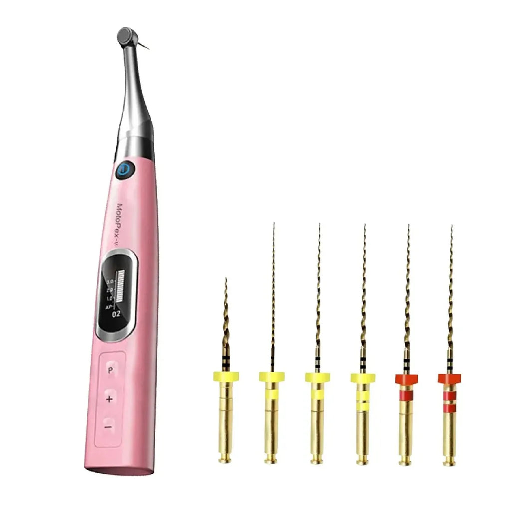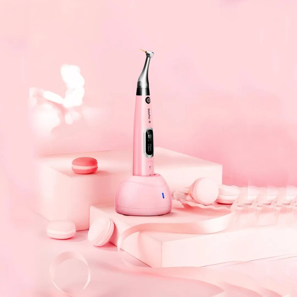 Woodpecker Motopex-M Endo Motor is a cordless and colorful endo motor manufactured by Woodpecker. It is specifically designed for use in the biomechanical preparation of root canals during endodontic procedures. The device is equipped with various advantageous features that enhance its performance and efficiency. One of the notable features of the MotoPex-M is its brushless motor, which ensures a quieter operation with minimal vibrations. This makes the endo motor more comfortable for both the dentist and the patient during the procedure. Additionally, the brushless motor provides a more powerful and precise rotation, enabling precise control over the instrument. The endo motor also features the smallest contra-angle head with a 6:1 gear ratio. The slim neck design allows for better accessibility and maneuverability in tight spaces, facilitating the dentist's work. Furthermore, the MotoPex-M is designed with a balance weight distribution, ensuring stability and ease of use.