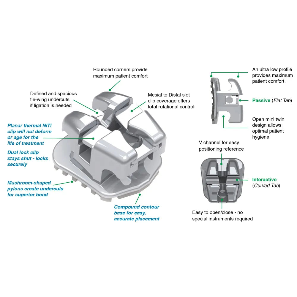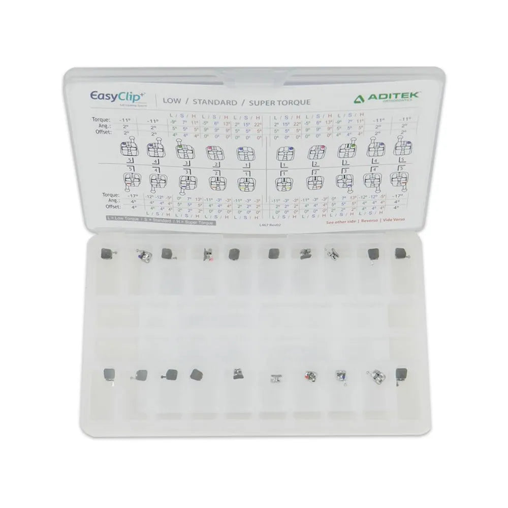 The Aditek Easyclip SLB Passive 022 Standard Dual Control Brackets Kit (05211290) offers orthodontic professionals a comprehensive solution for precise and efficient orthodontic treatments. This kit includes EasyClip Passive Self-Ligating (SLB) 022 Standard Brackets in a 5x5 configuration. These brackets feature a dual control design, allowing for enhanced control and customization during treatment. With a standard torque prescription, they provide versatility and reliability in orthodontic procedures. The EasyClip SLB Brackets simplify wire adjustments and eliminate the need for ligatures, streamlining the orthodontic process. This kit is designed by Aditek Orthodontics, known for quality and innovation in orthodontic products. Overall, the Aditek Easyclip SLB Passive 022 Standard Dual Control Brackets Kit is a valuable tool for orthodontists seeking precision and optimal treatment outcomes.