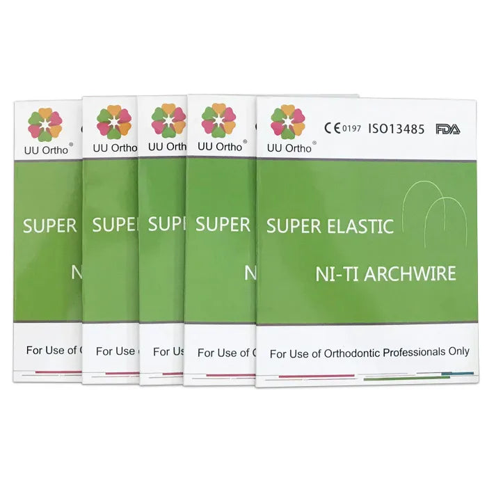UU Ortho Super Elastic NiTi Archwires - Rectangular, a remarkable solution for orthodontic treatment consists of preformed NiTi archwires that feature an ovoid arch form and a rectangular cross section, combining key characteristics to optimize patient comfort and treatment efficiency. Crafted from super elastic nickel-titanium alloy, these archwires exhibit higher elasticity and lower rigidity, ensuring gentle yet consistent recovery forces. They deliver continuous activation, reducing the need for frequent archwire changes and providing more efficient tooth movement. The advanced metallurgical composition of these archwires ensures constant force delivery while remaining completely austenitic at room temperature.