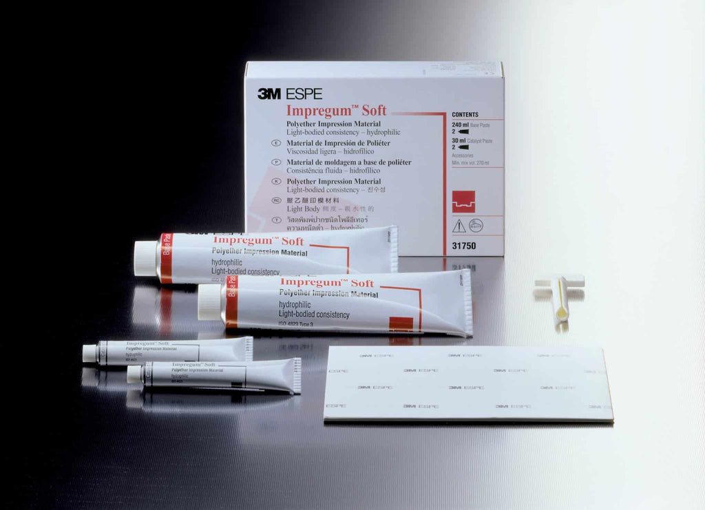 mpregum™ Soft Light Body impression material can be used with either Impregum Soft Medium Body or Impregum Soft Heavy Body impression material for the one-step/two viscosity technique. For onlay, inlay, bridge, crown, implant and functional impressions.