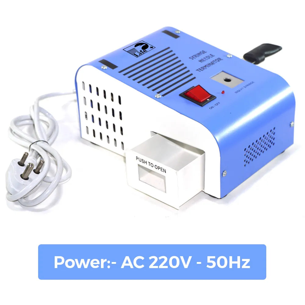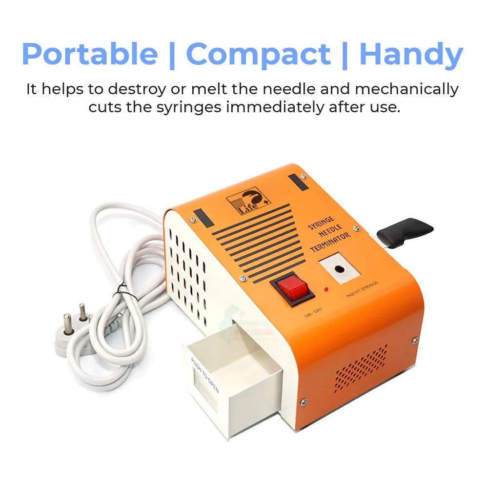 Life Syringe Needle Terminator is electrically operated equipment that destroys the needle and mechanically cuts the syringes simultaneously. Available in Two-color option Blue & Orange