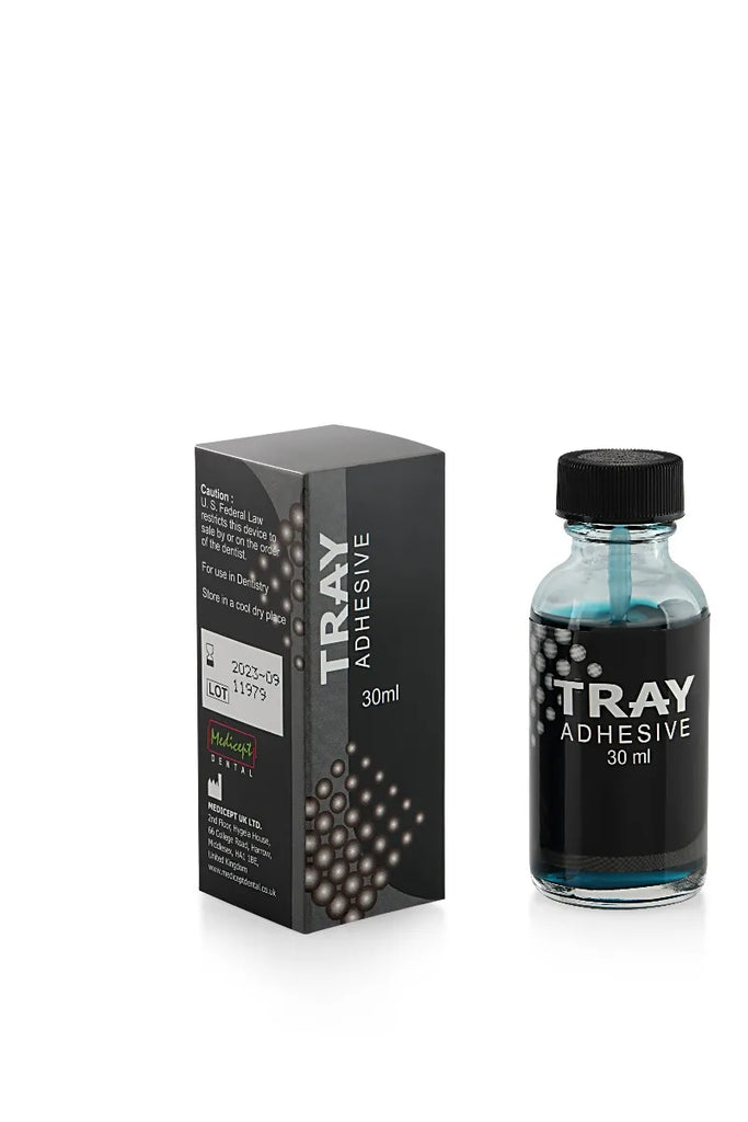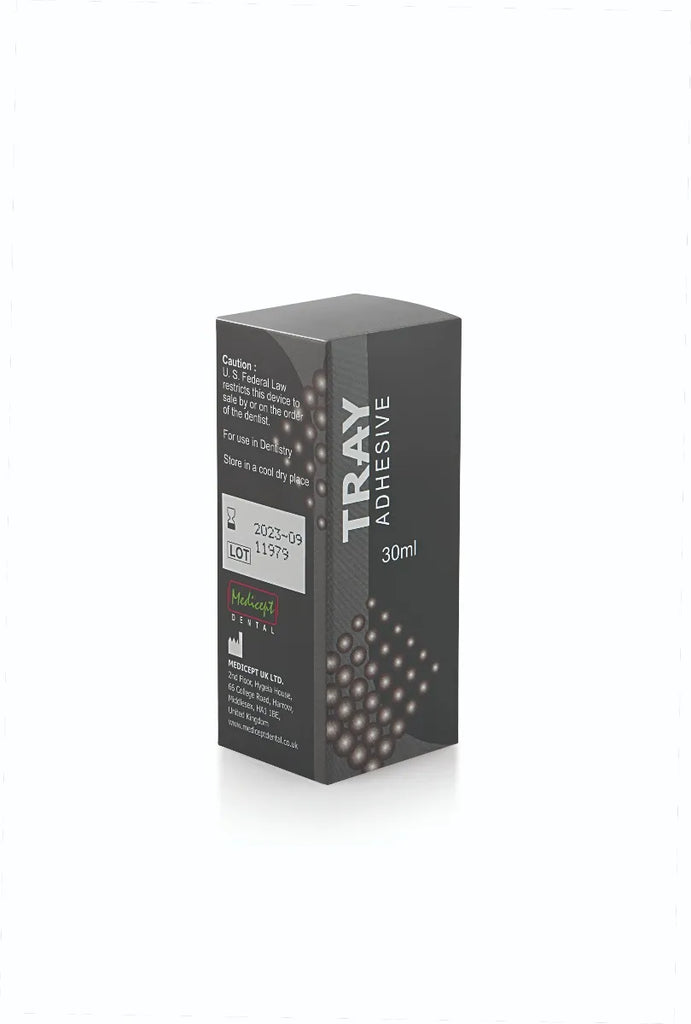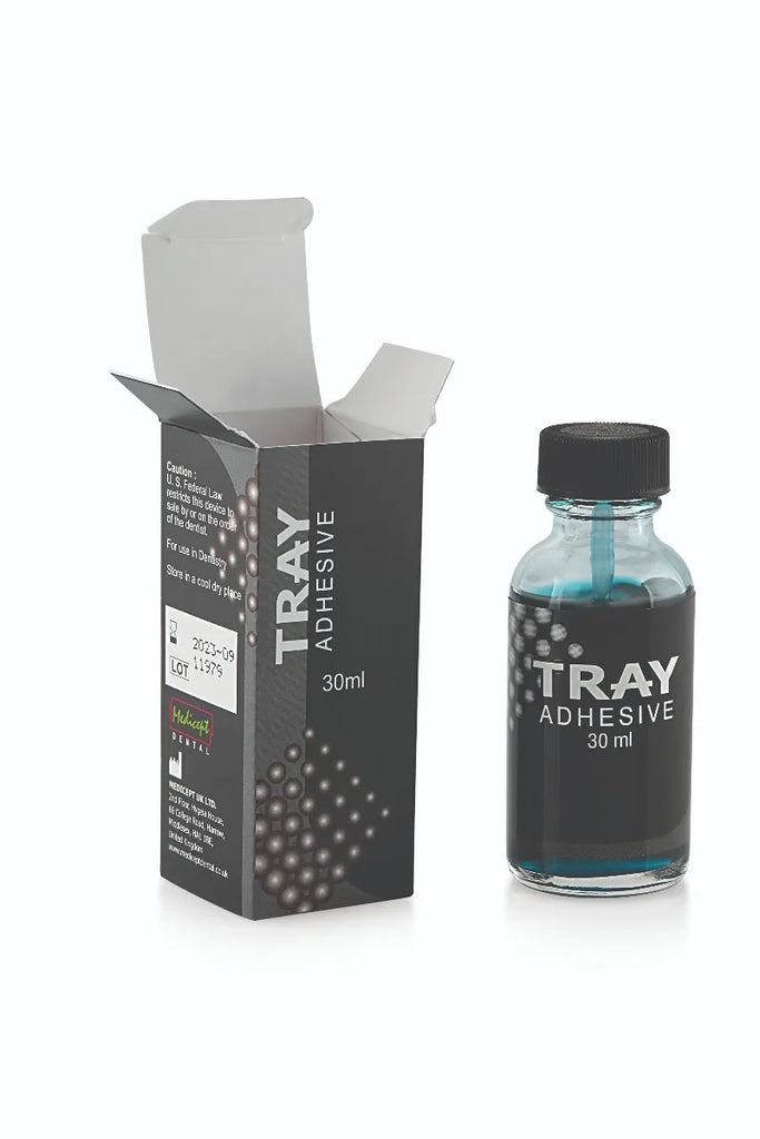 Medicept Tray Adhesive is a specialized paint-on product designed for use with alginate impression material in dentistry. Its primary function is to improve the adhesion of alginate to dental trays during the impression-taking process. The adhesive creates a strong and reliable bond, ensuring that the alginate material stays securely in the tray without distortion or tearing during removal from the patient's mouth. Its watery, thin-flowing consistency allows for easy application without adding thickness to the impression material. Moreover, the adhesive evaporates quickly, preventing any interference with the alginate's chemical properties or setting process. It is particularly effective for bonding with metal trays. Medicept Tray Adhesive is a valuable aid for dental professionals, contributing to obtaining high-accuracy impressions and successful dental restorations. Proper application following the manufacturer's guidelines is essential for optimal results.