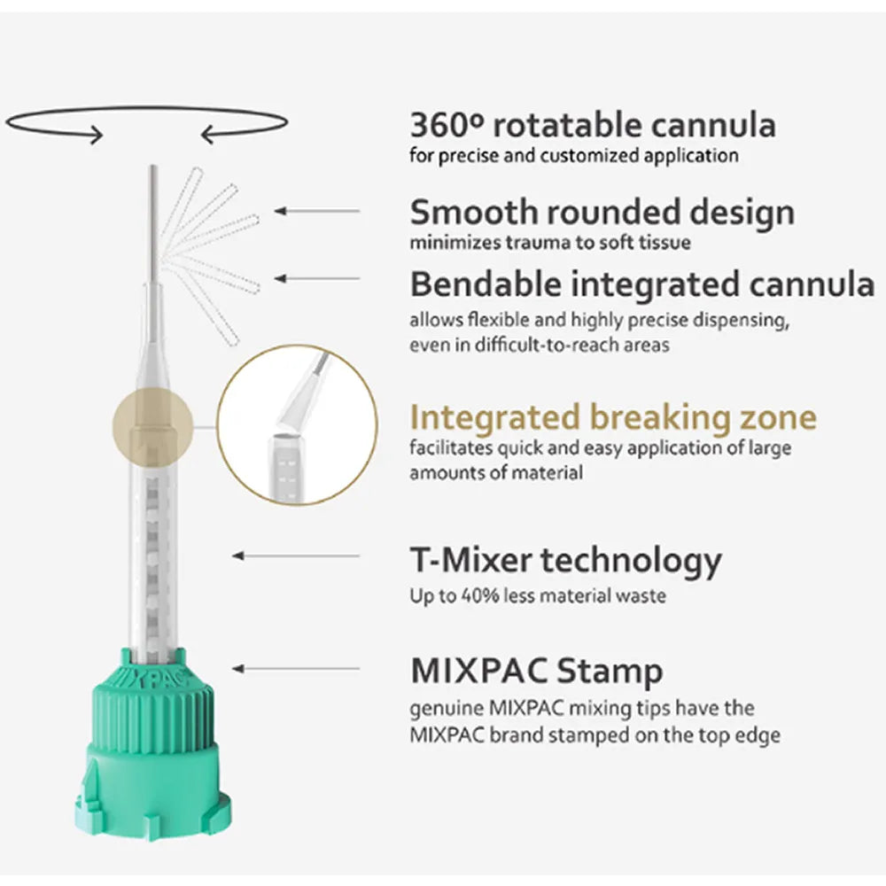Medmix Mixpac T-Mixer Colibri Plus Breakable consists of a mixing tip with a built-in cannula that is used to directly dispense the material at the clinical site. The cannula is constructed of smooth, round medical-grade stainless steel for safe application in the gingival sulcus and root canals, and it can be fully rotated 360° for easy access to sites. The cannula is also bendable upto 180 º while maintaining a constant inner diameter for a consistent flow of material from the tip. The T-Mixer Colibri plus breakable is fully compatible with MIXPAC cartridges containing 18 to 75 mL of material.