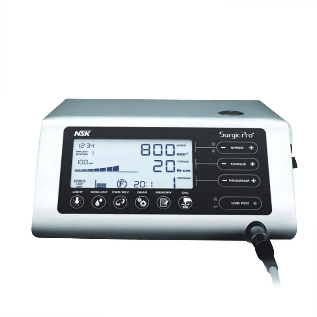The NSK Surgic Pro+ - Optic with Ti-Max X DSG20L Handpiece is a state-of-the-art dental surgical system designed to provide exceptional performance and reliability for oral surgery procedures and implantology. It combines advanced technology, user-friendly features, and a compact design, making it a versatile and efficient tool for dental specialists.The Surgic Pro+ offers 8 programs that can be customized to accommodate different implant systems, allowing for seamless integration into your clinical workflow.