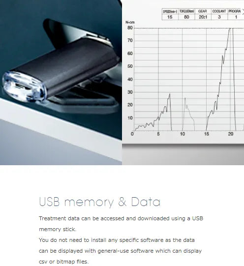 The Surgic Pro+ features a built-in data storage facility that allows for the recording of various treatment parameters. These include the date, speed, rotational direction, torque, gear ratio, and irrigation solution flow setting. The system offers a recording time of up to 100 minutes, with each recording capturing the date, time, and duration of the operation. The recorded data can be easily accessed and downloaded using a USB memory stick (not included), and can be displayed with general-use software that supports CSV or bitmap files