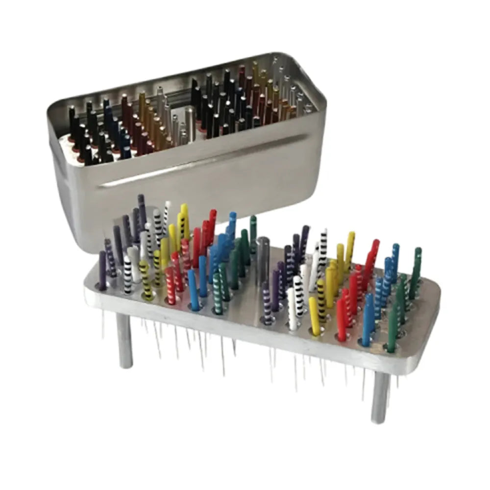 The Oracraft Endo Box With 72 Holes - AEB is a dental instrument used for organizing and storing endodontic files, reamers, and other small dental instruments. The box is made of high-quality stainless steel and has 72 numbered holes to hold instruments securely in place. The AEB model features a lockable lid to secure the instruments during transportation or storage. The Oracraft Endo Box With 72 Holes - AEB is an essential tool for any dental practice that performs endodontic procedures. It helps to organize and protect dental instruments, reducing the risk of contamination and damage.