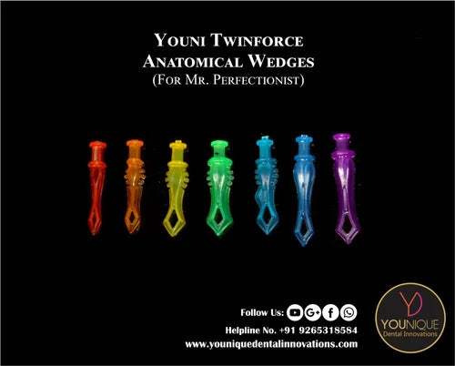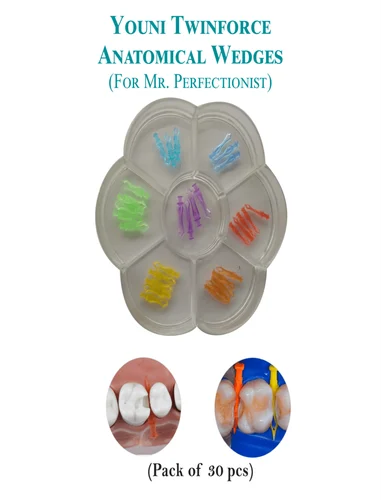 Youni Twin Force Anatomical Wedges are designed for optimal interproximal contact in restorative dental procedures. These anatomical wedges provide excellent adaptation to tooth contours, ensuring a secure and tight seal during fillings. Made from high-quality materials, they offer durability and comfort while minimizing soft tissue irritation. Ideal for composite and amalgam restorations, they help achieve better matrix placement and more precise results.